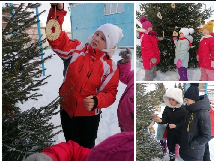 Ребята изготовили вкусные лакомства в виде коржиков, ёлочек, баранок. Украсили их семечками, зернами пшена, ячневой крупой, овсяными хлопьями. Развешали их на красавицу ёлку.В кормушки положили самые вкусные лакомства.